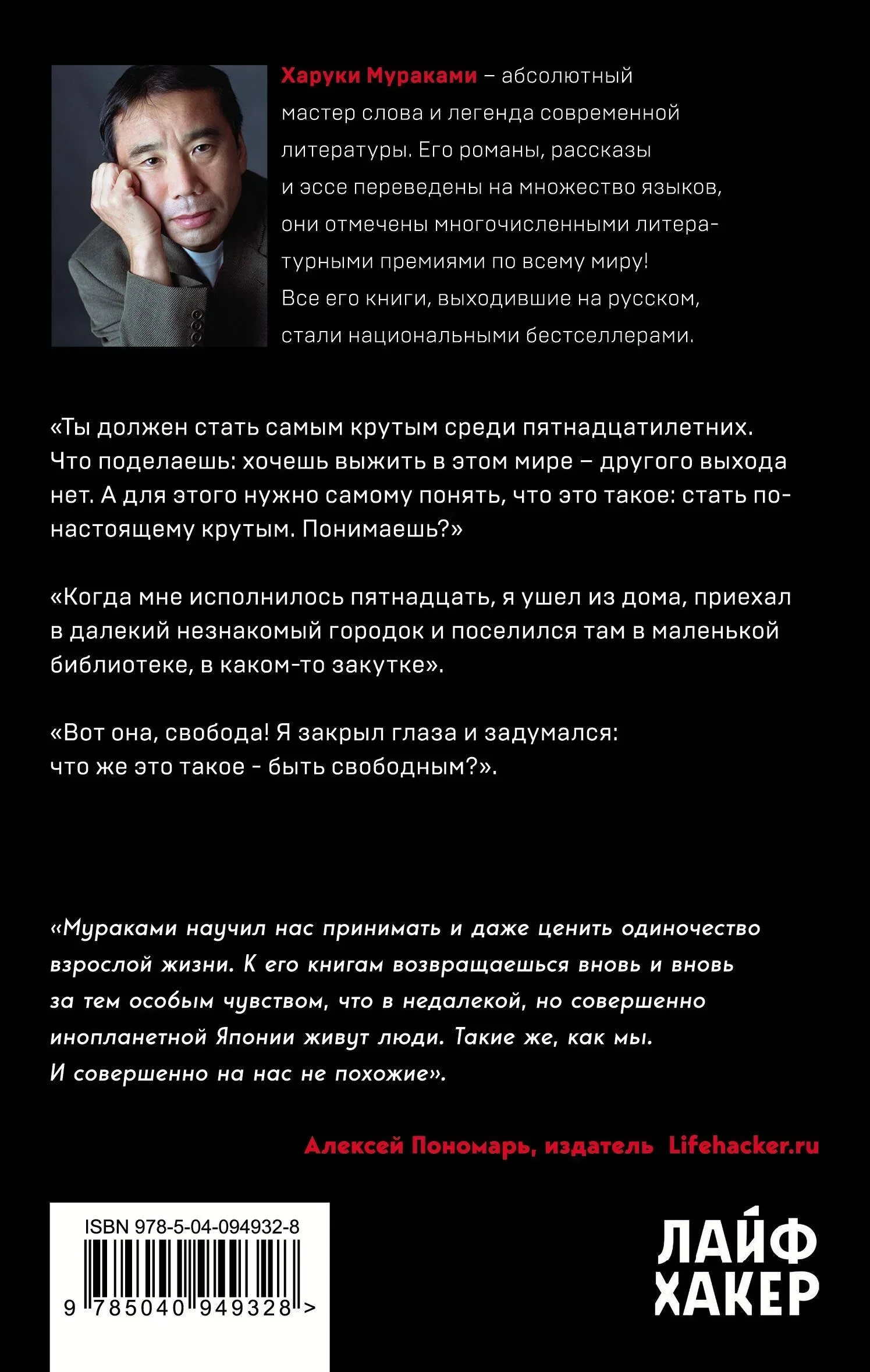 Харуки Мураками — самый знаменитый и невероятно популярный японский писатель. Все его книги, выходившие на русском, стали национальными бестселлерами, переведены на множество языков и отмечены многочисленными литературными премиями по всему миру. «Ты должен стать самым крутым среди пятнадцатилетних. Что поделаешь: хочешь выжить в этом мире — другого выхода нет. А для этого надо самому понять, что это такое: стать по-настоящему крутым. Понимаешь?» «Когда мне исполнилось 15, я ушел из дома, приехал в далекий незнакомый городок и поселился там в маленькой библиотеке, в каком-то закутке». «Вот она свобода! Я закрыл глаза и задумался: что же это такое — быть свободным?» «Мураками научил нас принимать и даже ценить одиночество взрослой жизни. К его книгам возвращаешься вновь и вновь за тем особым чувством единения с совершенно инопланетной Японией, в которой живут люди. Такие же, как мы. И совершенно на нас не похожие». — Алексей Пономарь, издатель Лайфхакера (Лого) ЛАЙФХАКЕРА