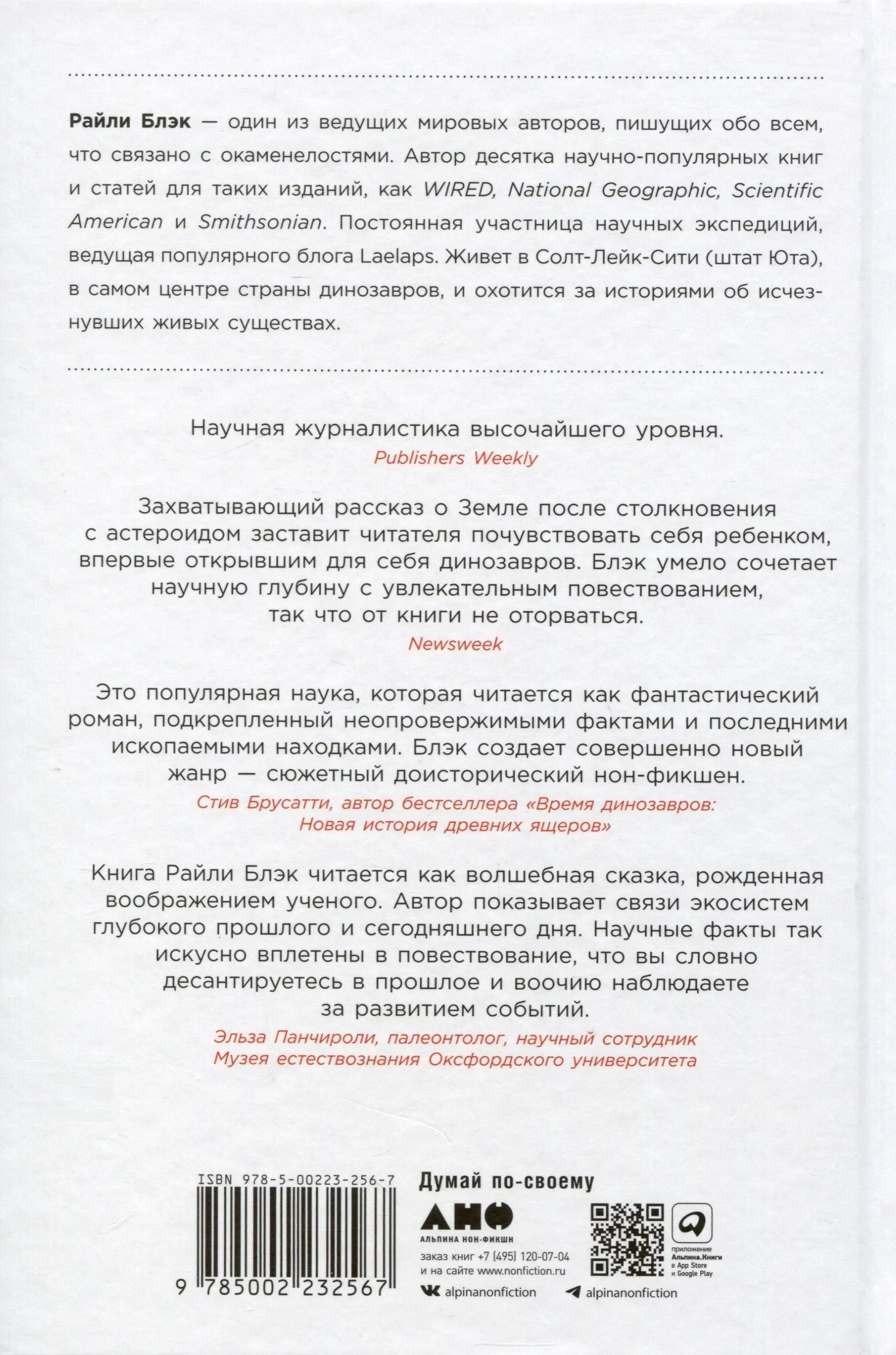 Эта книга — уникальна. Райли Блэк воспроизводит картину событий массового вымирания мелового периода на примерах конкретных животных так, словно присутствовала там и тогда сама. Все начинается в преддверии катастрофы, а затем, глава за главой мы следуем по пути героев Райли Блэк в разные дни их жизни: через час, через день, месяц, год, столетие, вплоть до миллиона лет после столкновения нашей планеты с астероидом. Пока на Землю надвигается конец света, мы узнаем, как мучается от раковой опухоли трицерапторс, как трудно прокормить свое огромное тело тираннозавру рексу и как опасен этот мир для едва вылупившегося из яйца и брошенного мамой аламозавра. Но самое страшное — и самое интересное — впереди. Чтобы не отвлекать читателя от сюжета, в конце книги Блэк дает обширное приложение с комментариями, поясняющими, какие из описаний соответствуют научным фактам, а что в портретах и биографиях героев домыслено. Впрочем, наука не стоит на месте и, вполне вероятно, что сегодняшние гипотетические построения автора завтра найдут подтверждения.
