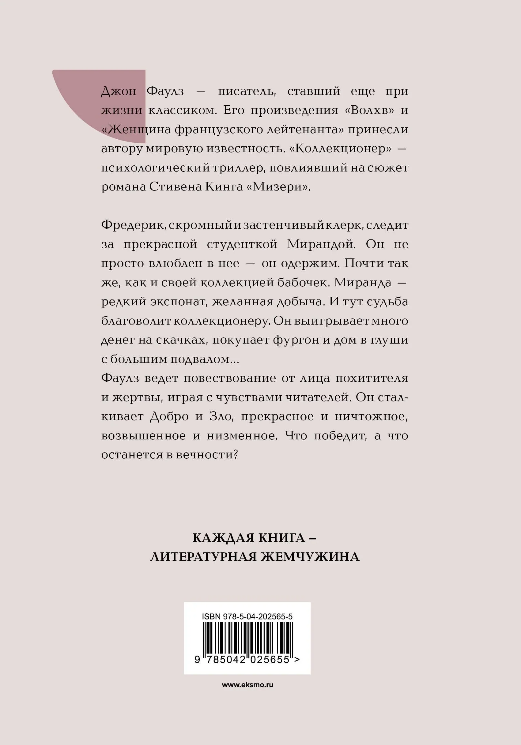 Каждая книга серии — это литературная жемчужина. Джон Фаулз — писатель, ставший еще при жизни классиком. Его произведения «Волхв» и «Женщина французского лейтенанта» принесли автору мировую известность. «Коллекционер» — психологический триллер, повлиявший на сюжет романа Стивена Кинга «Мизери». Фредерик, скромный и застенчивый клерк, следит за прекрасной студенткой Мирандой. Он не просто влюблен в нее — он одержим. Почти так же, как и своей коллекцией бабочек. Миранда — редкий экспонат, желанная добыча. И тут судьба благоволит коллекционеру. Он выигрывает много денег на скачках, покупает фургон и дом в глуши с большим подвалом… Фаулз ведет повествование от лица похитителя и жертвы, играя с чувствами читателей. Он сталкивает Добро и Зло, прекрасное и ничтожное, возвышенное и низменное. Что победит, а что останется в вечности? Оформление обложки вдохновлено стилями «тихая роскошь» и «old money». Минималистичная серия «Жемчужина. Классика тихой роскоши» создается как изящное дополнение к культовым образам принцессы Дианы и Жаклин Кеннеди. Эти книги могут довершить стильный образ успешной девушки, а также стать частью интерьера квартиры, ресторана, гостиницы и других пространств. Благодаря металлизированной бумаге создается эффект свечения обложки. Краски мягко и тихо переливаются. На корешке символ книги сделан тиснением серебром, что усиливает эффект внутреннего света. Объемное тиснение фигур создает приятное тактильное ощущение. Текст напечатан на белой бумаге, мягкой на ощупь. Для серии подобран крупный и удобный шрифт, от которого не устанут глаза.