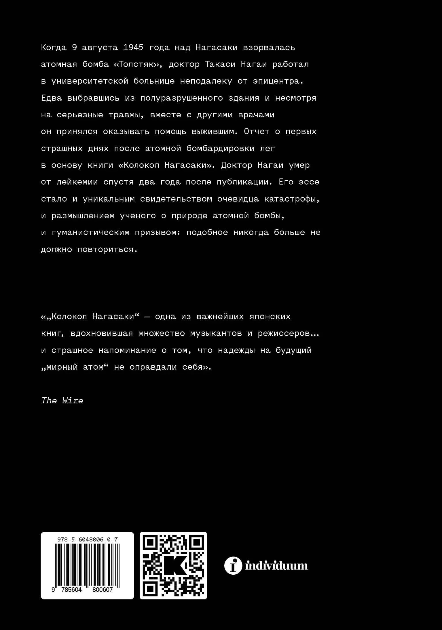 Когда 9 августа 1945 года над Нагасаки взорвалась атомная бомба «Толстяк», доктор Такаси Нагаи работал в университетской больнице неподалеку от эпицентра. Едва выбравшись из полуразрушенного здания и несмотря на серьезные травмы, вместе с другими врачами он принялся оказывать помощь выжившим. Отчет о первых страшных днях после атомной бомбардировки лег в основу книги «Колокол Нагасаки». Доктор Нагаи умер от лейкемии спустя два года после публикации. Его эссе стало и уникальным свидетельством очевидца катастрофы, и размышлением ученого о природе атомной бомбы, и гуманистическим призывом: подобное никогда больше не должно повториться.