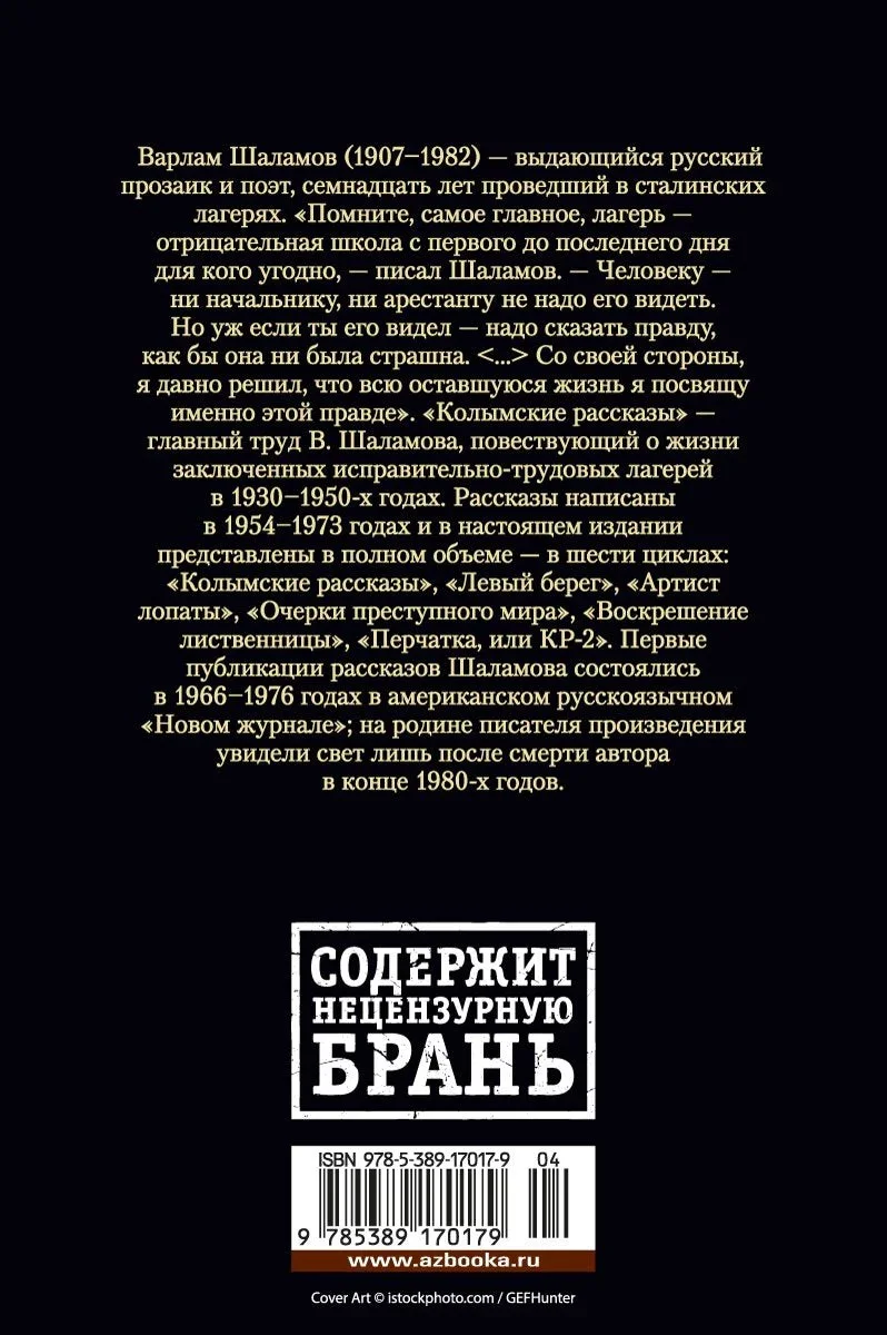 Варлам Шаламов (1907–1982) — выдающийся русский прозаик и поэт, семнадцать лет проведший в сталинских лагерях. «Помните, самое главное, лагерь — отрицательная школа с первого до последнего дня для кого угодно, — писал Шаламов. — Человеку — ни начальнику, ни арестанту не надо его видеть. Но уж если ты его видел — надо сказать правду, как бы она ни была страшна. <…> Со своей стороны я давно решил, что всю оставшуюся жизнь я посвящу именно этой правде». «Колымские рассказы» — главный труд В. Шаламова, повествующий о жизни заключенных исправительно-трудовых лагерей в 1930–1950 гг. Рассказы написаны в 1954–1973 гг. и в настоящем издании представлены в полном объеме — в шести циклах: «Колымские рассказы», «Левый берег», «Артист лопаты», «Очерки преступного мира», «Воскрешение лиственницы», «Перчатка, или КР-2». Первые публикации рассказов Шаламова состоялись в 1966–1976 гг. в американском русскоязычном «Новом журнале» на родине писателя произведения увидели свет лишь после смерти автора в конце 1980-х годов.