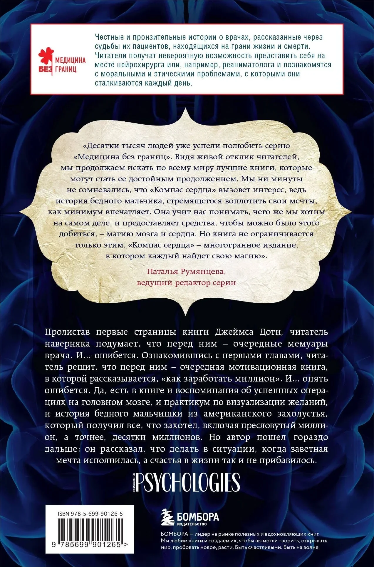 Прочитав эту книгу, вы: - прежде всего хорошо проведете время, ведь история парня из неблагополучной семьи, который стал всемирно известным врачом, интересна сама по себе - сможете освоить и применить на практике простую технику исполнения желаний, изложенную подробно и доступно - поймете, что мешает вашим мечтам воплотиться в реальность, а может, и осознаете, чего же вы хотите на самом деле. Фишки книги Идея о пользе визуализации желаний отнюдь не нова. Каждый из нас не раз слышал: хочешь что-то получить — мысленно представь, будто желаемое у тебя уже есть. Но как именно представлять? Как часто? Как долго? А главное — как и почему это может сработать? Магии ведь не существует! «Ну отчего же? Существует», — возражает Джеймс Доти, известный нейрохирург и основатель Центра исследований в области сострадания и альтруизма. Есть магия мозга — нейропластичность, способность головного мозга меняться и тем самым изменять жизнь человека. А вот изменится ли она в лучшую или в худшую сторону, зависит от магии сердца — способности к состраданию и альтруизму. Овладеть обоими видами магии совсем несложно: в книге рассмотрены все необходимые для этого упражнения. Книга «Компас сердца» вдохновила Чона Чонгука, солиста группы BTS, написать песню “Magic Shop”. Джеймс Доти даже поблагодарил в своем Твиттере группу за использование его книги в качестве вдохновения. «Поступай с другими так, как хочешь, чтобы поступали с тобой», — гласит известный афоризм. «Если мы хотим быть счастливыми, то должны делать счастливыми других. Если хотим любви, то должны дарить любовь окружающим. Если хотим радости, то должны радовать людей. Если хотим прощения, то должны сами научиться прощать. Если хотим мира, то должны создать его вокруг себя», — пишет в своей книге Джеймс Доти. И это не просто красивые фразы, а реально действующая формула успеха. Для кого эта книга Эта книга даже не с двойным, а с тройным дном, поэтому каждый найдет в ней что-нибудь для себя: • и тот, кто просто хочет скоротать часок-другой за интересной книгой • и тот, кого занимают тайны человеческого мозга • и тот, кто стремится к духовному самосовершенствованию.