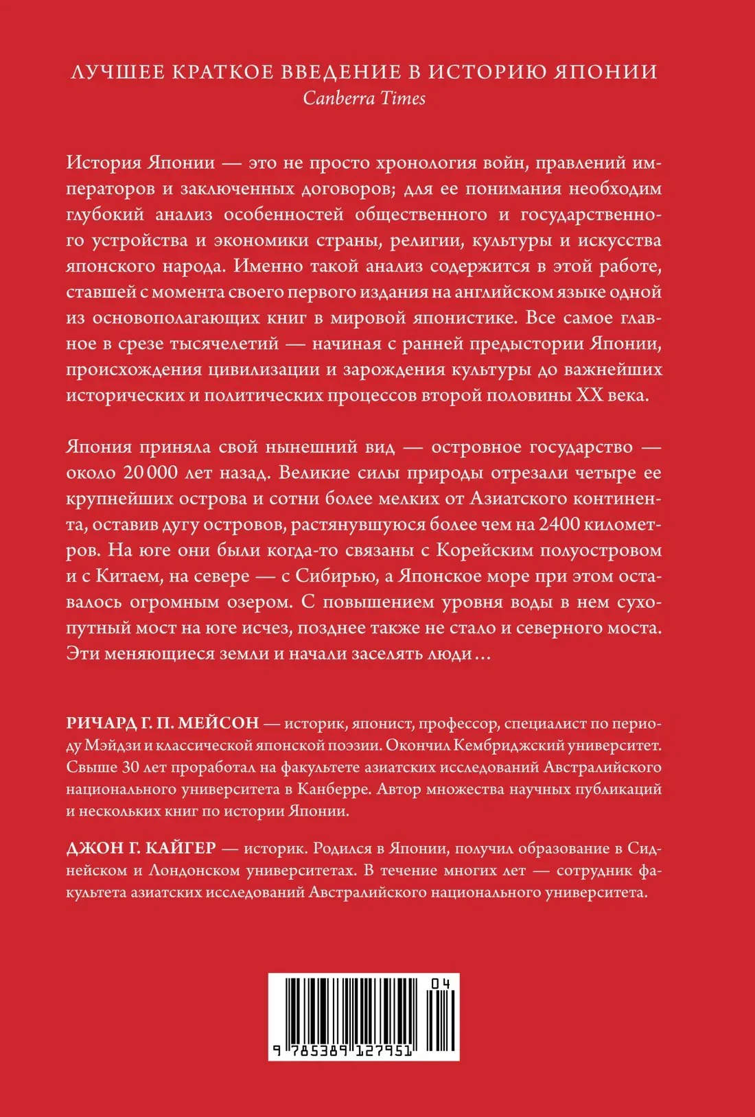 Обновленное и дополненное издание книги, ставшей с момента своего первого издания на английском языке одной из основополагающих книг в мировой японистике. В ней охвачены все важнейшие аспекты истории Японии — от первобытного и архаического периодов (ранние поселения, начало государственного объединения, создание единого государства, внешняя, внутренняя политика и культура эпохи Хэйан) и Средневековья (правление военных домов, развитие буддизма), до эпох Раннего Нового времени (возвышение военачальников Ода Нобунага и Тоётоми Хидэёcи, период Момояма, сёгунат Токугава, развитие рыночной экономики) и современной Японии (реставрация Мэйдзи, политика модернизации, военные действия времен Второй мировой войны и дальнейшая оккупация). В хорошо структурированном повествовании много внимания уделяется японской культуре — религии, литературе, живописи, архитектуре, театру. Книга, снабженная черно-белыми иллюстрациями, а также картами и генеалогическими древами, адресована всем, кто интересуется «истоками японской современности».