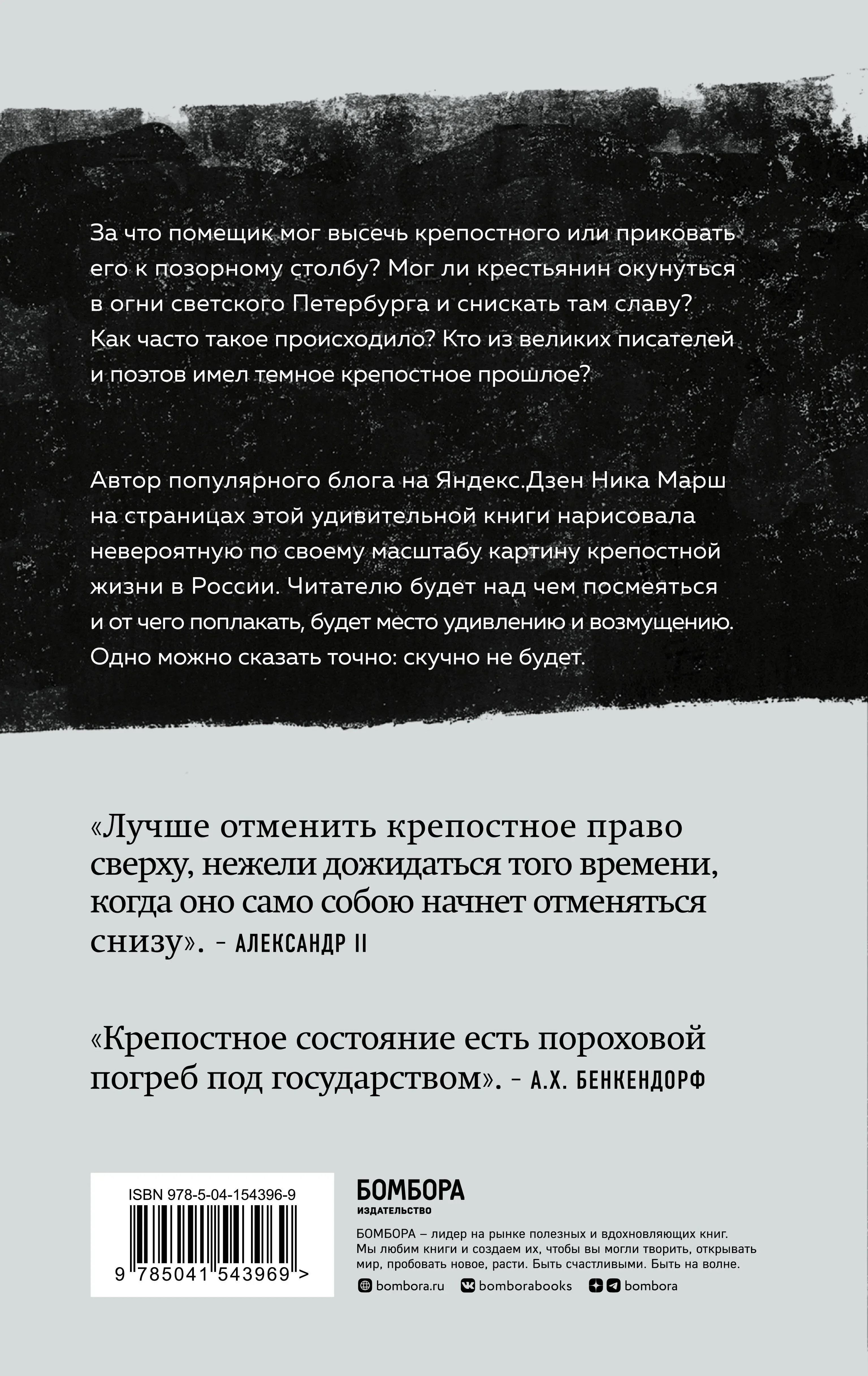 Сколько стоил крепостной? Имел ли он право жениться или на это требовалось одобрение хозяина? Все ли крепостные были безграмотны? Автор популярного блога на Яндекс.Дзен Ника Марш дает ответы на эти и многие другие вопросы о крепостном праве в России. В этой книге вы не найдете анализа сухих исторических фактов. Ника Марш — мастер сторителлинга. Каждый факт или явление она сопровождает яркими, интересными, иногда трагическими, а нередко — смешными историями людей. Постепенно в этом калейдоскопе чужих историй читатель начинает видеть вполне логичный орнамент, а затем понимает, что жизнь крепостных в России прошлого имеет намного больше общего с сегодняшним днем, чем хотелось бы…