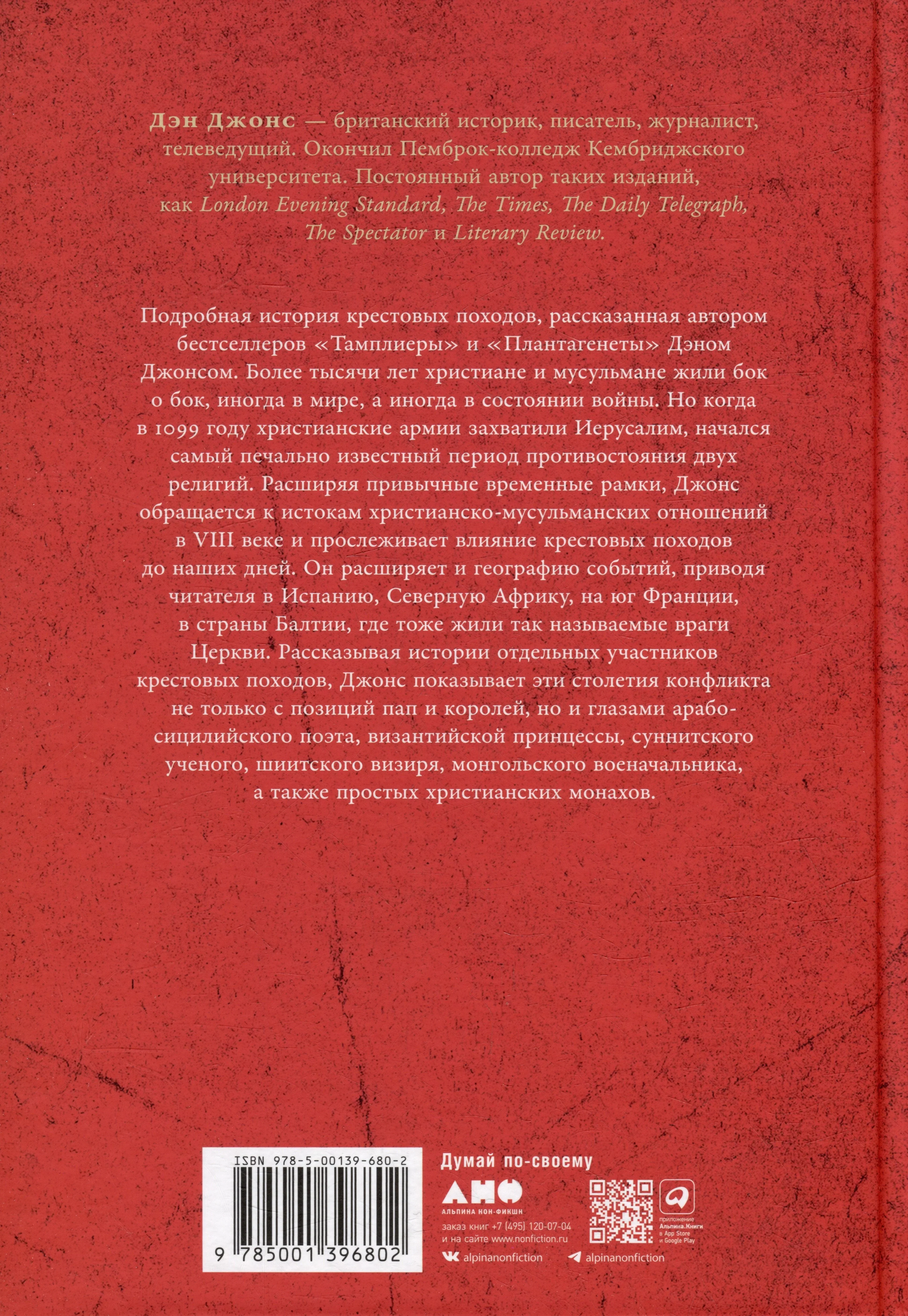 Подробная история крестовых походов, рассказанная автором бестселлеров «Тамплиеры» и «Плантагенеты» Дэном Джонсом. Более 1000 лет христиане и мусульмане жили бок о бок, иногда в мире, а иногда в состоянии войны. Но когда в 1099 г. христианские армии захватили Иерусалим, начался самый печально известный период противостояния двух религий. Расширяя привычные временные рамки, Джонс обращается к истокам христианско-мусульманских отношений в VIII в. и прослеживает влияние крестовых походов до наших дней. Он расширяет и географию событий, приводя читателя в Испанию, Северную Африку, на юг Франции, в страны Балтии, где тоже жили «враги Церкви». Рассказывая истории отдельных участников крестовых походов, Джонс показывает эти столетия конфликта не только с позиций пап и королей, но и глазами арабо-сицилийского поэта, византийской принцессы, суннитского ученого, шиитского визиря, монгольского военачальника, а также простых христианских монахов.