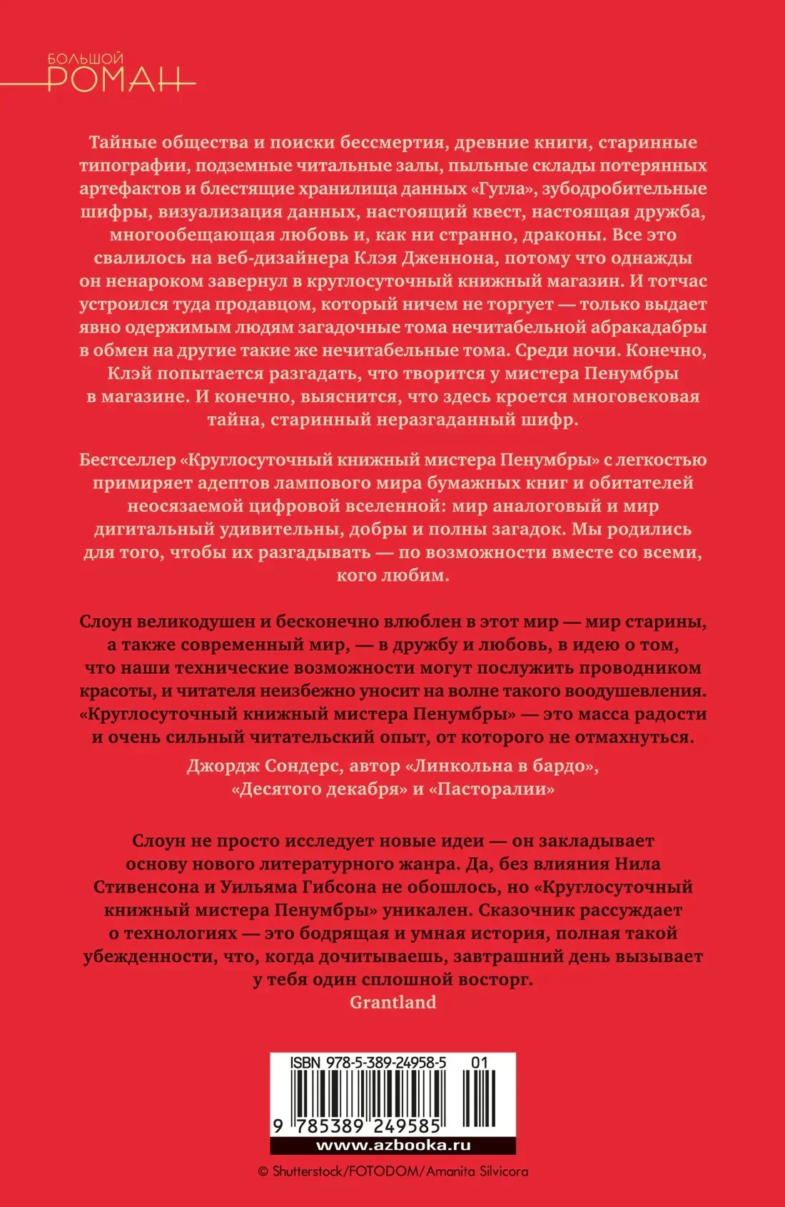 Тайные общества и поиски бессмертия, древние книги, старинные типографии, подземные читальные залы, пыльные склады потерянных артефактов и блестящие хранилища данных «Гугла», зубодробительные шифры, визуализация данных, настоящий квест, настоящая дружба, многообещающая любовь и, как ни странно, драконы. Все это свалилось на веб-дизайнера Клэя Дженнона, потому что он, потеряв работу и бесцельно блуждая по Сан-Франциско, ненароком завернул в круглосуточный (и, между прочим, вертикальный) книжный магазин. И тотчас устроился туда продавцом, который ничем не торгует — только выдает явно одержимым людям загадочные тома нечитабельной абракадабры в обмен на другие такие же нечитабельные тома. Среди ночи. Конечно, Клэй попытается разгадать, что творится у мистера Пенумбры в магазине. Конечно, выяснится, что здесь кроется многовековая тайна, старинный неразгаданный шифр. И этот шифр вместе с Клэем будут взламывать кодеры и библиотекари, археологи и дизайнеры, хакеры и музейные хранители, создатели спецэффектов и скалолазы. «Круглосуточный книжный мистера Пенумбры» побывал в списках бестселлеров The New York Times и National Public Radio, сразу после публикации был признан книгой года по версии Los Angeles Times, San Francisco Chronicle и NPR, а впоследствии издан в тридцати с лишним странах. Эта книга — поклон Нилу Стивенсону, Уильяму Гибсону, Харуки Мураками, Дэну Брауну и раннему Умберто Эко, но главным образом — футурологическим теориям самого Робина Слоуна, который с легкостью примиряет адептов лампового мира бумажных книг с обитателями неосязаемой цифровой вселенной, потому что просто-напросто не видит между ними противоречий. Мир аналоговый и мир дигитальный удивительны, добры и полны загадок. Мы родились для того, чтобы их разгадывать — по возможности вместе со всеми, кого любим. Роман «Круглосуточный книжный мистера Пенумбры» и его предыстория, повесть «Аякс Пенумбра 1969», публикуются в новом переводе и впервые под одной обложкой.