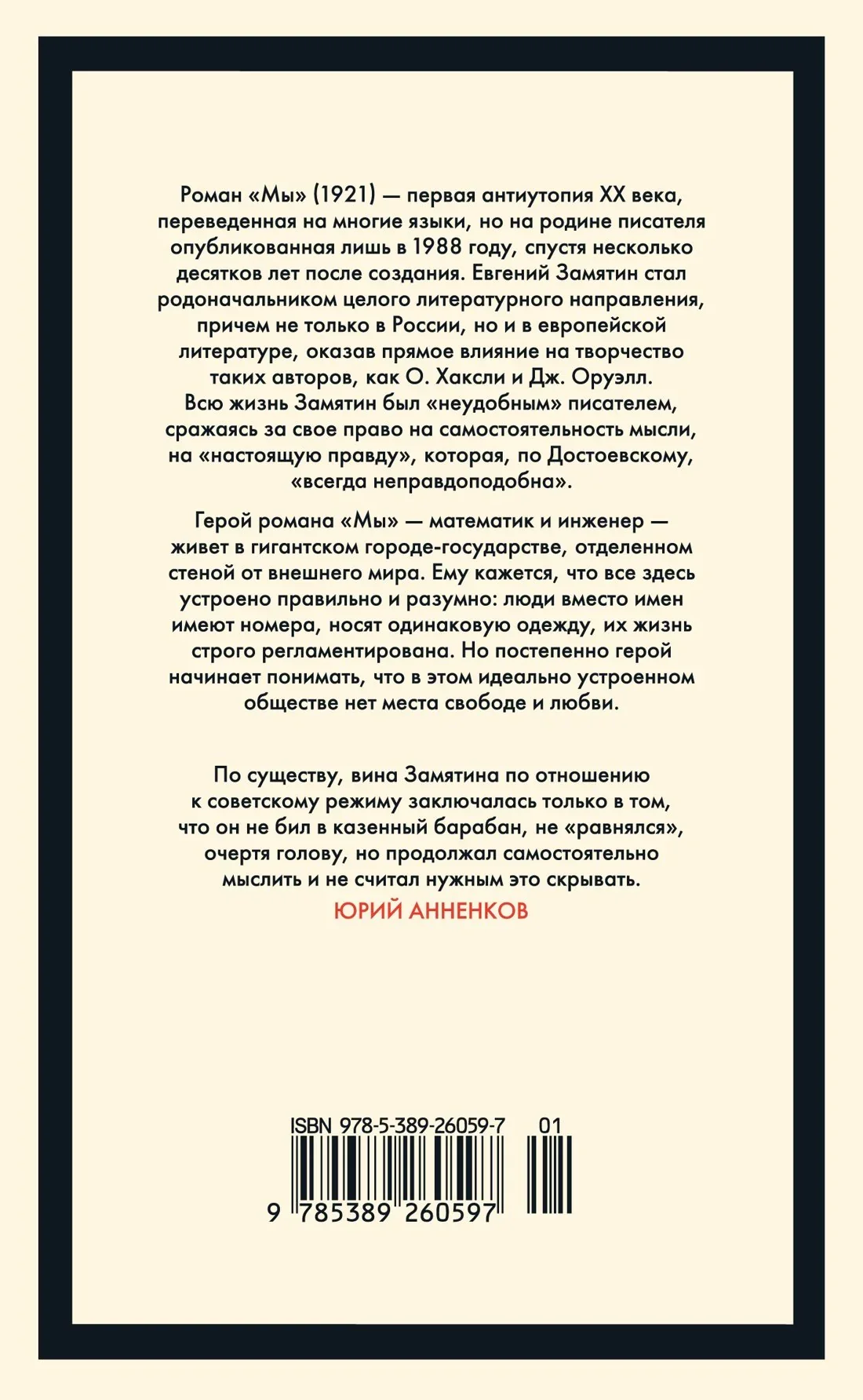 Роман Евгения Замятина «Мы» (1921) — первая антиутопия ХХ века, переведенная на многие языки, но на родине писателя опубликованная лишь в 1988 году, спустя несколько десятков лет после создания. Герой романа «Мы» — математик и инженер — живет в гигантском городе-государстве, отделенном стеной от внешнего мира. Ему кажется, что все здесь устроено правильно и разумно: люди вместо имен имеют номера, носят одинаковую одежду, их жизнь строго регламентирована. Но постепенно герой начинает понимать, что в этом идеально устроенном обществе нет места свободе и любви.