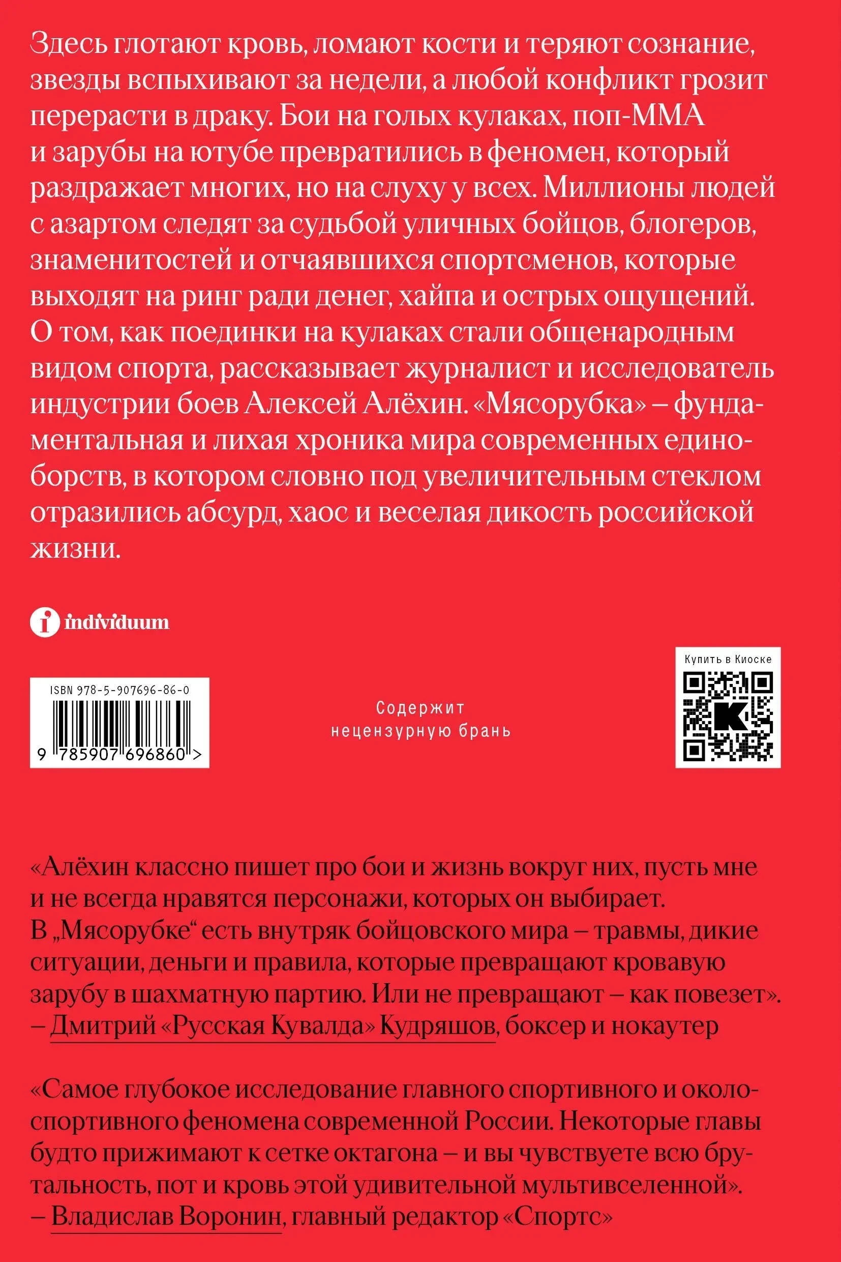 Здесь глотают кровь, ломают кости и теряют сознание, звезды вспыхивают за недели, а любой конфликт грозит перерасти в драку. Бои на голых кулаках, поп-ММА и зарубы на ютубе превратились в феномен, который раздражает многих, но на слуху у всех. Миллионы людей с азартом следят за судьбой уличных бойцов, блогеров, знаменитостей и отчаявшихся спортсменов, которые выходят на ринг ради денег, хайпа и острых ощущений. О том, как поединки на кулаках стали общенародным видом спорта, рассказывает журналист и исследователь индустрии боев Алексей Алёхин. «Мясорубка» — фундаментальная и лихая хроника мира современных единоборств, в котором словно под увеличительным стеклом отразились абсурд, хаос и веселая дикость российской жизни.