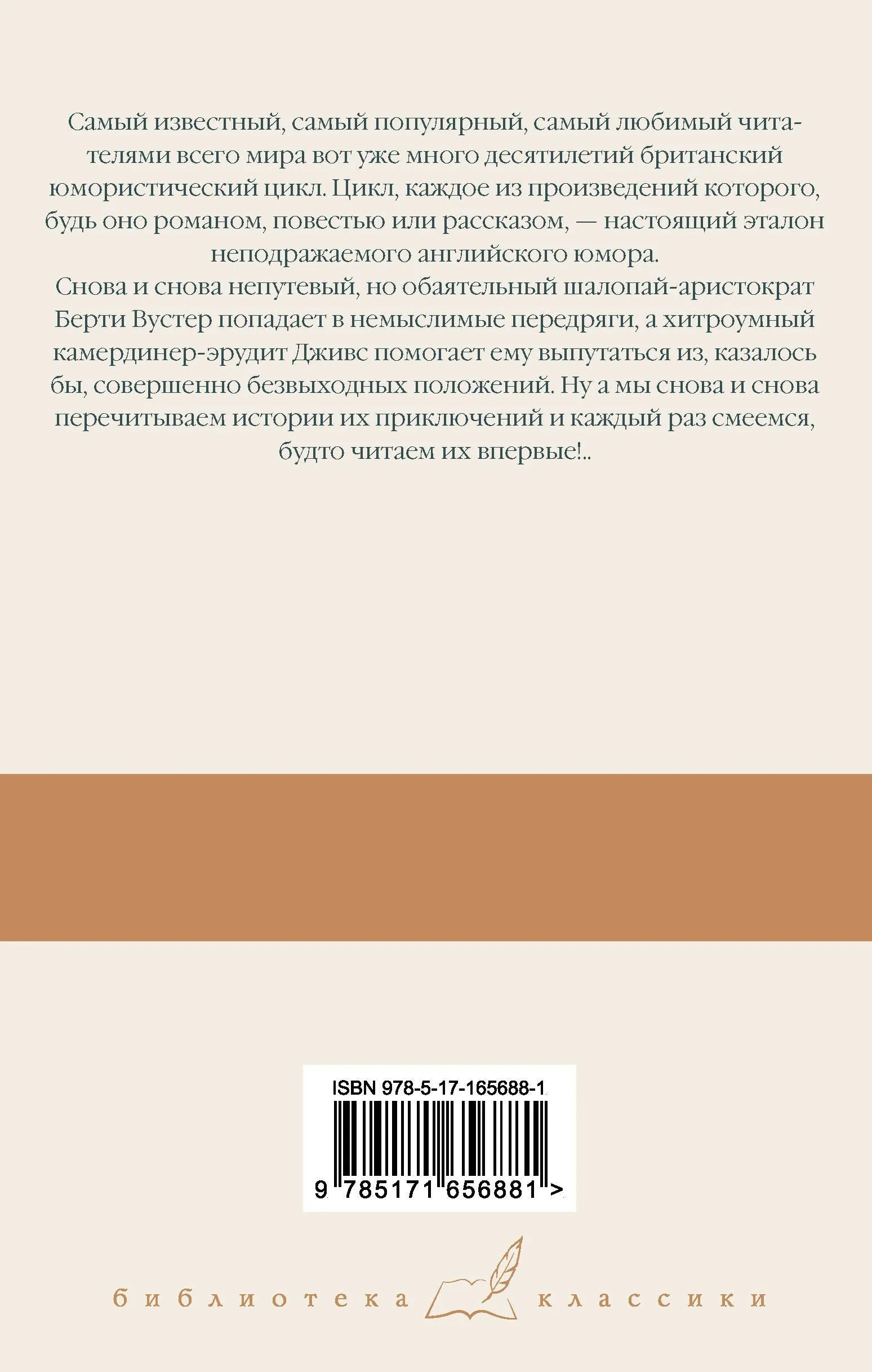 Самый известный, самый популярный, самый любимый читателями всего мира вот уже много десятилетий британский юмористический цикл. Цикл, каждое из произведений которого, будь оно романом, повестью или рассказом, — настоязий эталон неподражаемого английского юмора. Снова и снова непутевый, но обаятельный шалопай-аристократ Берри Вустер попадает в немыслимые передряги, а хитроумный камердинер-эрудит Дживс помогает ему выпутаться из, казалось бы, совершенно безвыходных положений. Ну а мы снова и снова перечитываем истории их приключений и каждый раз смеемся, будто читаем их впервые!..