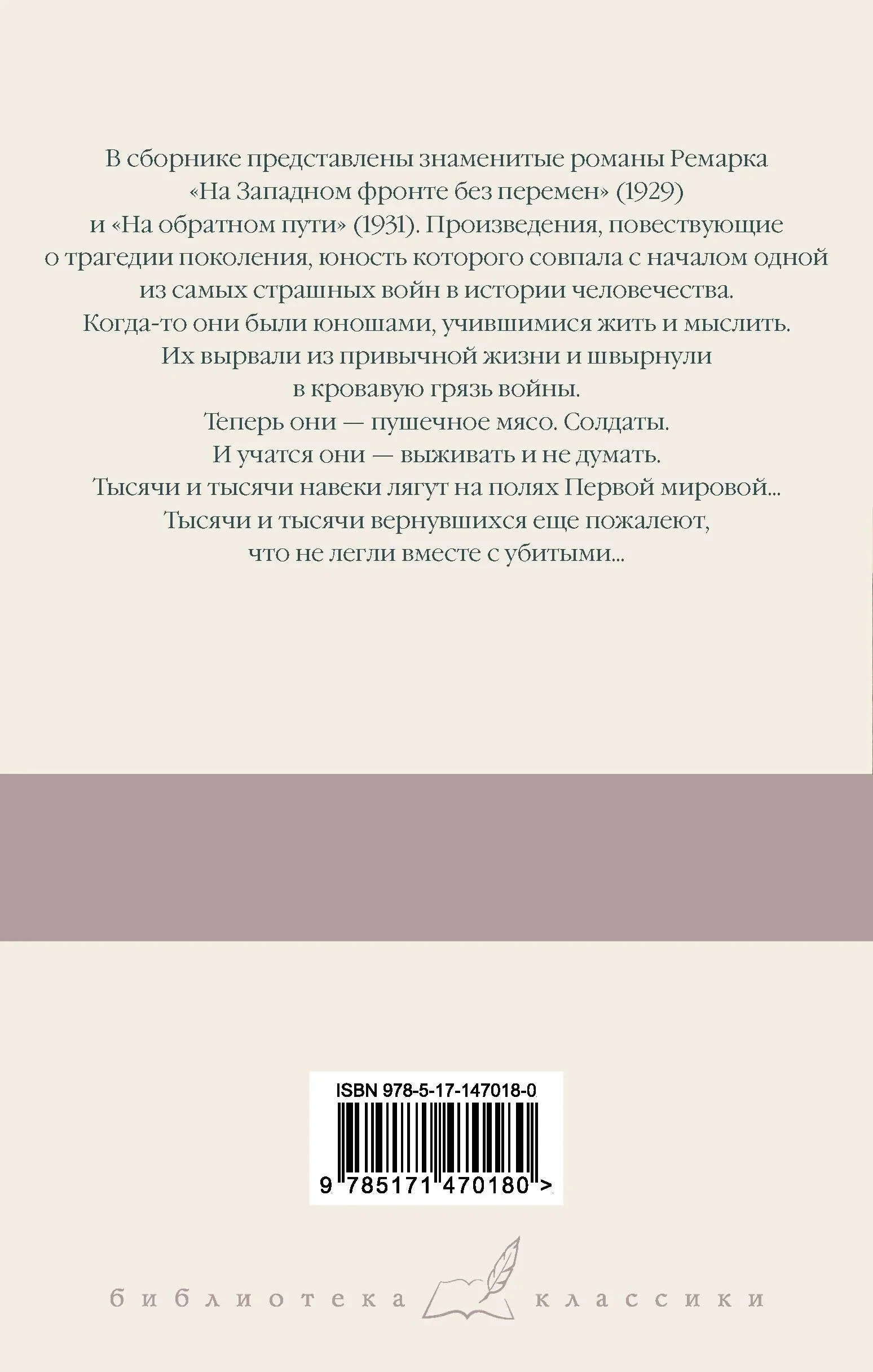В сборнике представлены знаменитые романы Ремарка "На Западном фронте без перемен" (1929) и "На обратном пути" (1931). Произведения, повествующие о трагедии поколения, юность которого совпала с началом одной из самых страшных войн в истории человечества.Когда-то они были юношами, учившимися жить и мыслить. Их вырвали из привычной жизни и швырнули в кровавую грязь войны.Теперь они — пушечное мясо. Солдаты. И учатся они — выживать и не думать.Тысячи и тысячи навеки лягут на полях Первой мировой...Тысячи и тысячи вернувшихся еще пожалеют, что не легли вместе с убитыми...
