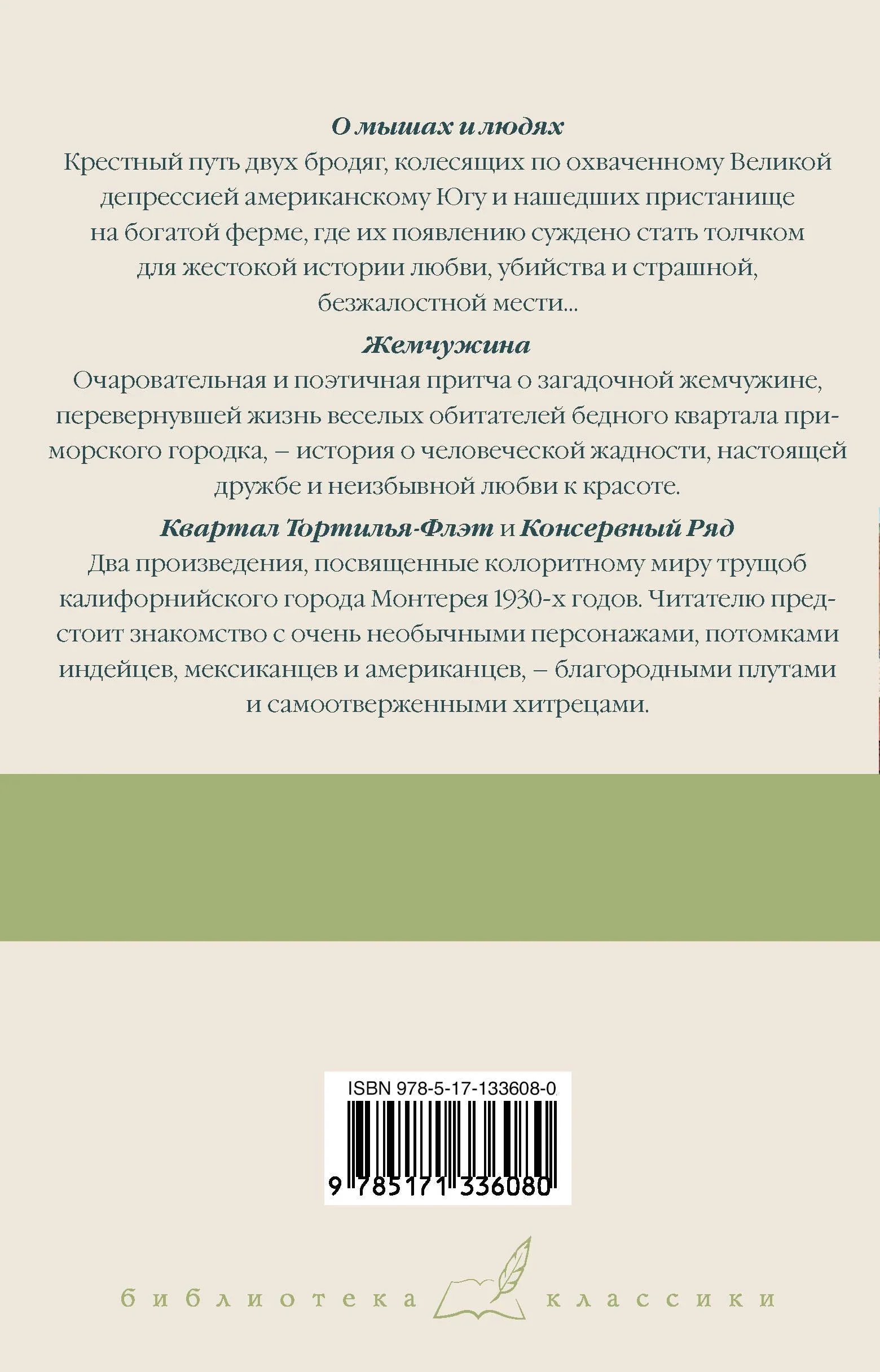 "О мышах и людях". Крестный путь двух бродяг, колесящих по охваченному Великой депрессией американскому Югу и нашедших пристанище на богатой ферме, где их появлению суждено стать толчком для жестокой истории любви, убийства и страшной, безжалостной мести…"Жемчужина". Очаровательная и поэтичная притча о загадочной жемчужине, перевернувшей жизнь веселых обитателей бедного квартала приморского городка, – история о человеческой жадности, настоящей дружбе и неизбывной любви к красоте."Квартал Тортилья-Флэт" и "Консервный ряд" – два произведения, посвященные колоритному миру трущоб калифорнийского города Монтерея 1930-х годов. Читателю предстоит знакомство с очень необычными персонажами, потомками индейцев, мексиканцев и американцев, – благородными плутами и самоотверженными хитрецами.