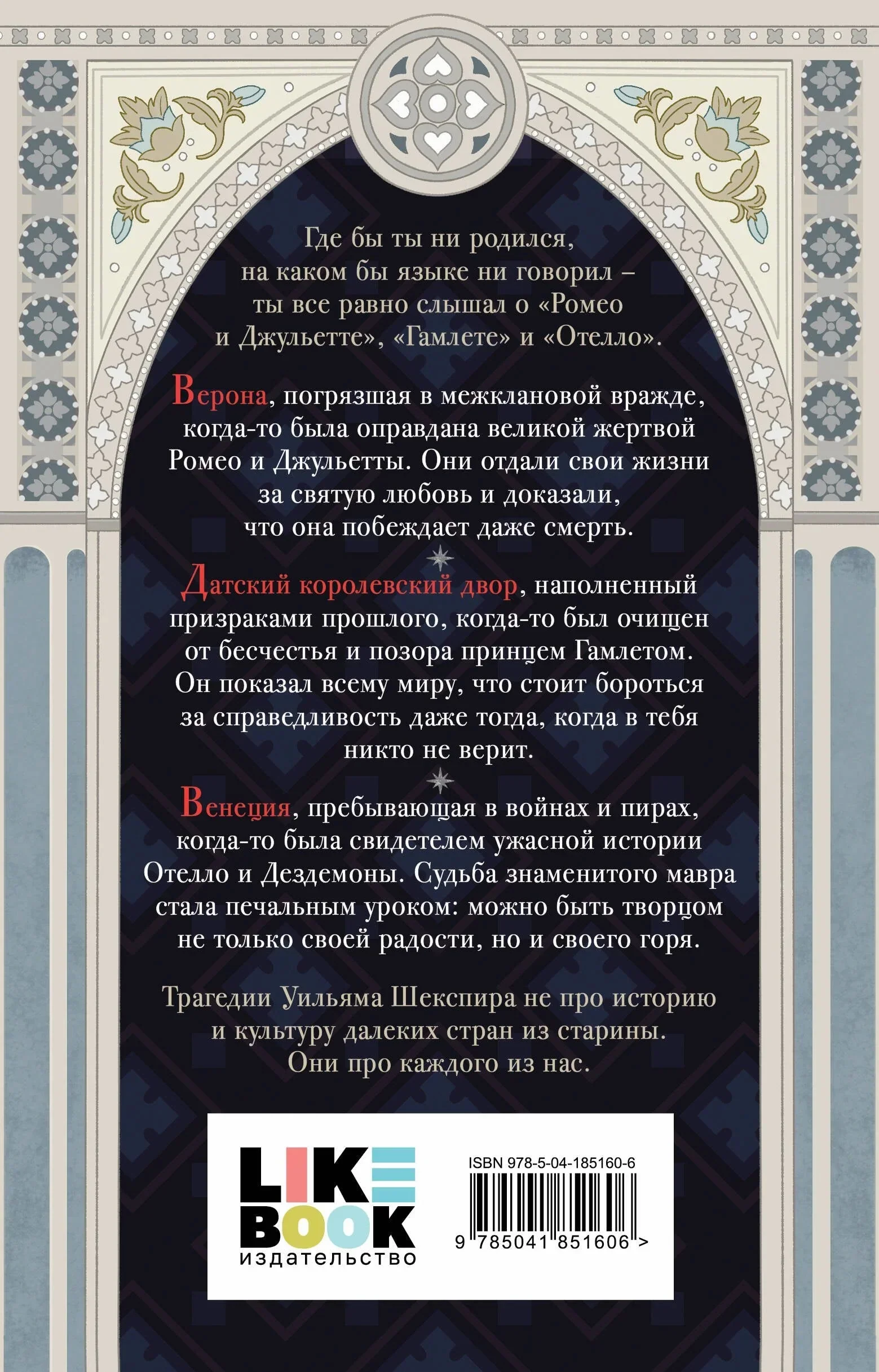 ВЕЧНЫЕ ТРАГЕДИИ УИЛЬЯМА ШЕКСПИРА: «РОМЕО И ДЖУЛЬЕТТА», «ГАМЛЕТ», «ОТЕЛЛО» ПОД ОДНОЙ ОБЛОЖКОЙ! МИРОВОЙ БЕСТСЕЛЛЕР В ШИКАРНОМ ОФОРМЛЕНИИ И С ЗАКРАШЕННЫМ ОБРЕЗОМ! Нет повести печальнее на свете, чем повесть о Ромео и Джульетте. Где бы ты ни родился, на каком языке бы ни говорил — ты все равно слышал о «Ромео и Джульетте», «Гамлете» и «Отелло». Верона, погрязшая в межклановой вражде, когда-то была оправдана великой жертвой Ромео и Джульетты. Они отдали свои жизни за святую любовь и доказали, что она побеждает даже смерть. Датский королевский двор, наполненный призраками прошлого, когда-то был очищен от бесчестия и позора принцем Гамлетом. Он показал всему миру, что стоит бороться за справедливость даже тогда, когда в тебя никто не верит. Венеция, пребывающая в войнах и пирах, когда-то была свидетелем ужасной истории Отелло и Дездемоны. Судьба знаменитого мавра стала печальным уроком: можно быть творцом не только своей радости, но и своего горя. Трагедии Уильяма Шекспира не про историю и культуру далеких стран из старины. Они про каждого из нас. Качественная бумага, цветные форзацы, обложка от известного молодежного художника Caitllin, цветной обрез. Замечательный перевод Бориса Пастернака дополняет глубину чувств трагедий Уильяма Шекспира. Идеальный подарок для любимого человека! Читайте также в серии подарочных изданий У. Шекспира: «Комедии», «Исторические хроники», «Сонеты».